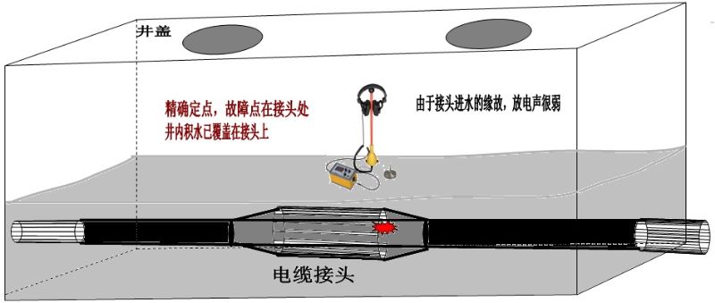 定位結(jié)果為故障在1231或1286米處(2數(shù)據(jù)不同,因?yàn)楣收暇嚯x分別通過(guò)電纜截面積全長(zhǎng)數(shù)據(jù)計(jì)算出來(lái)的。因?yàn)榻孛鏀?shù)據(jù)與實(shí)際截面有誤差,電纜總長(zhǎng)度也會(huì)有誤差)。與前面定位結(jié)果符合,短路第一個(gè)交叉互聯(lián)箱接地線,使放電脈沖能量盡可能傳到故障接頭處,在故障接頭上利用HDL-1A聲磁同步定點(diǎn)儀聽(tīng)聲音,有微弱聲音,并能確定為電纜接頭中的本體位置(圖5)。此外,還利用鋁護(hù)套表面測(cè)量跨步電壓的方法,進(jìn)一步確認(rèn)了故障接頭。