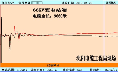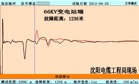 此次故障查找非常難,一,端頭為GIS且尾端為高架塔,無(wú)法用其他方法測(cè)試。二,故障類(lèi)型為接頭進(jìn)水故障和死接地故障的混合體。這次檢測(cè)遇到的是死接地故障,就是說(shuō)相和鎧形成金屬性短路后熔接到一起,使高壓脈沖聲音在故障點(diǎn)處被鎧吸收,并在故障點(diǎn)附件散開(kāi),聲音嚴(yán)重減弱,聲音沿著金屬鎧向遠(yuǎn)處傳向遠(yuǎn)端以至于在故障點(diǎn)處聲音微弱,且在以故障點(diǎn)為圓心,4百米半徑內(nèi)都能聽(tīng)到聲音。給音聽(tīng)法精確定點(diǎn)帶來(lái)障礙。反復(fù)在1200米處比較,反復(fù)測(cè)試,可以肯定故障點(diǎn)在1236米處的接頭處。