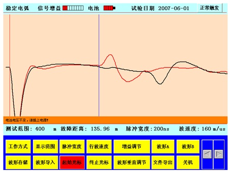 穩(wěn)定電弧法是近年新發(fā)展起來(lái)的一種電纜故障預(yù)定位方法,具體原理為:首先利用低壓脈沖反射法測(cè)試電纜高阻故障波形,然后配合穩(wěn)定電弧電源,在故障點(diǎn)擊穿瞬間自動(dòng)觸發(fā)HDTDR,HDTDR立即自動(dòng)發(fā)射、記錄并顯示故障擊穿后的低壓脈沖波形,通過(guò)查找兩個(gè)波形的分叉點(diǎn),容易找到故障點(diǎn),此種方法波形簡(jiǎn)單易識(shí)別。