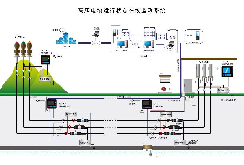 高壓電纜及隧道綜合在線監(jiān)控系統(tǒng)主要由集控中心服務(wù)器、變電站級服務(wù)器、遠程監(jiān)控終端、各種信號監(jiān)測器、各種控制器及其監(jiān)控設(shè)備構(gòu)成。通過光纖測溫全程監(jiān)測電纜表面溫度并計算線芯溫度和電纜載流量、測量電纜接頭及終端溫度、護層電流、瞬間故障電流、運行電流及局放來監(jiān)測電纜的運行狀態(tài),通過監(jiān)控電纜隧道水位、水泵、給排水、防爆風機、自動防火門、自動滅火器、煙霧報警器、有害氣體、氧氣含量、溫濕度、防盜井蓋、出入口門禁、視頻、紅外報警、聲光報警,隧道照明、電力隧道消防電話等進行環(huán)境監(jiān)控。采用現(xiàn)場總線或網(wǎng)絡(luò)通訊協(xié)議以光纜方式將監(jiān)測數(shù)據(jù)發(fā)送給變電站級服務(wù)器,變電站級服務(wù)器根據(jù)現(xiàn)場情況進行相應(yīng)的數(shù)據(jù)分析、故障判斷和控制,然后各個變電站級服務(wù)器將所有的監(jiān)測數(shù)據(jù)通過網(wǎng)絡(luò)傳輸?shù)郊刂行姆?wù)器并接受其控制指令,集控中心服務(wù)器可以對下面所屬的電力隧道環(huán)境和電纜多狀態(tài)參量進行集中監(jiān)測、數(shù)據(jù)分析、管理和實時控制。用戶可通過IE瀏覽各監(jiān)測點的電纜運行狀態(tài)及隧道環(huán)境狀態(tài)并可實時控制現(xiàn)場的監(jiān)控設(shè)備,同時可通過手機接收故障報警信號。如上圖所示: